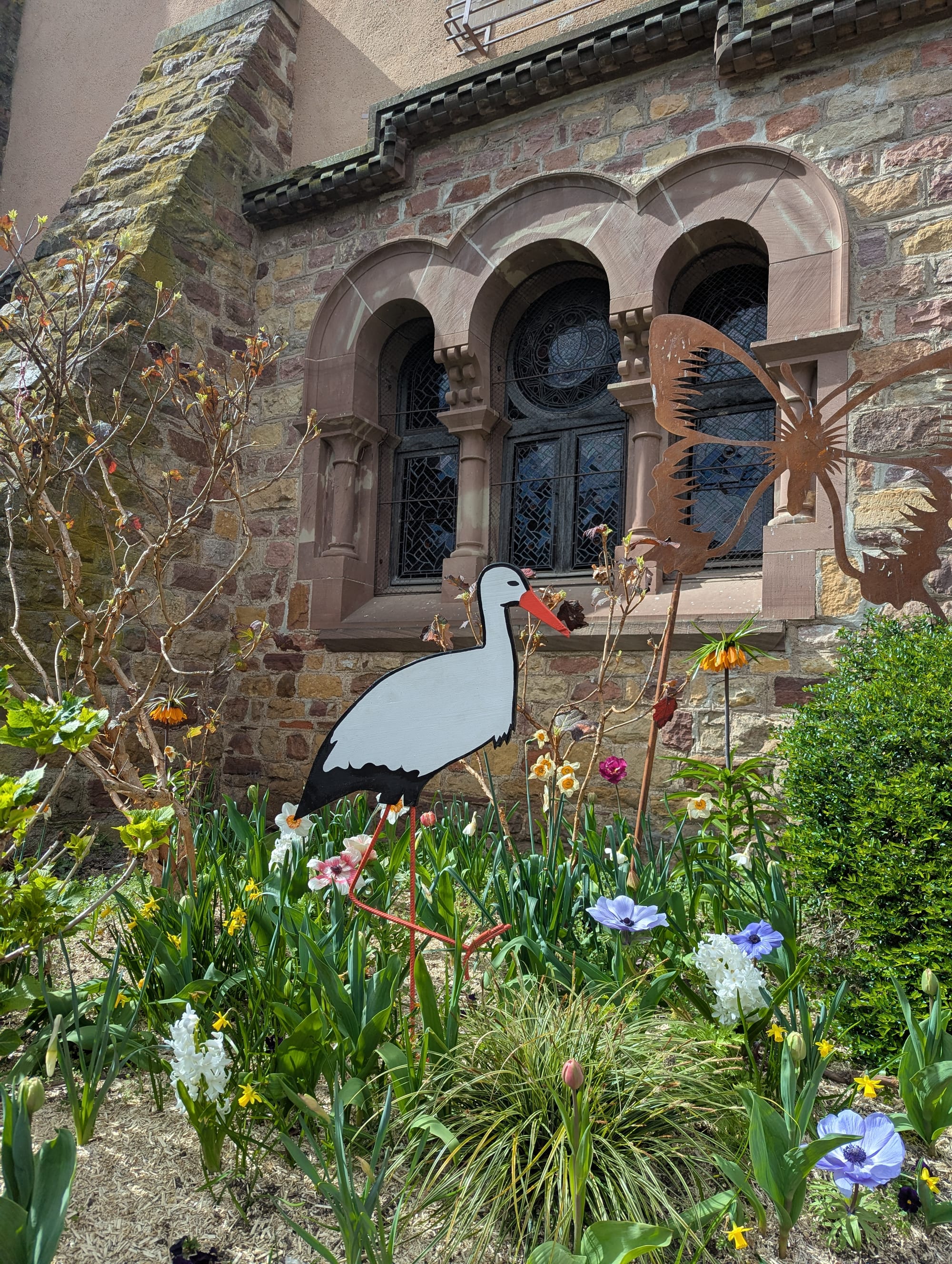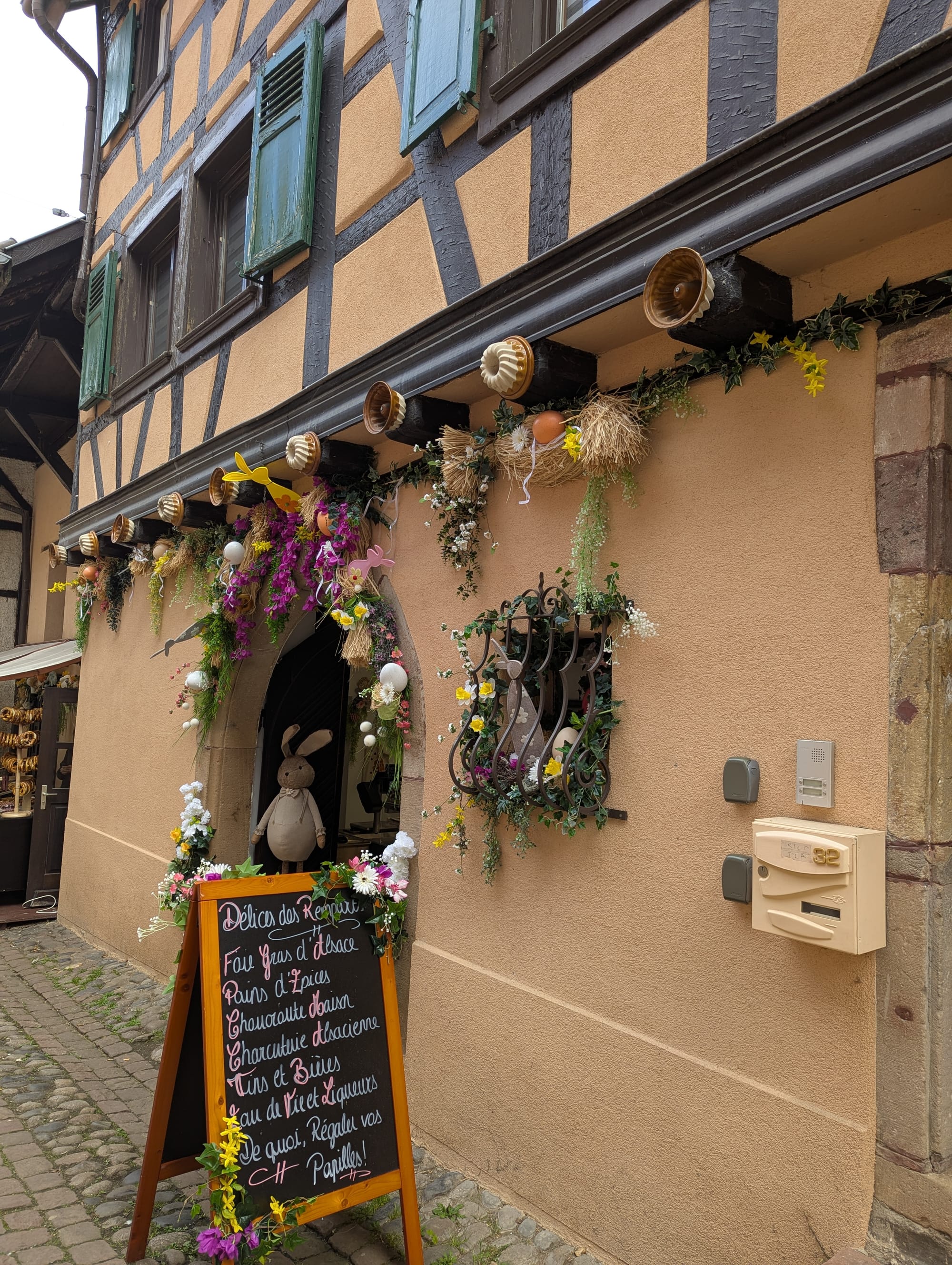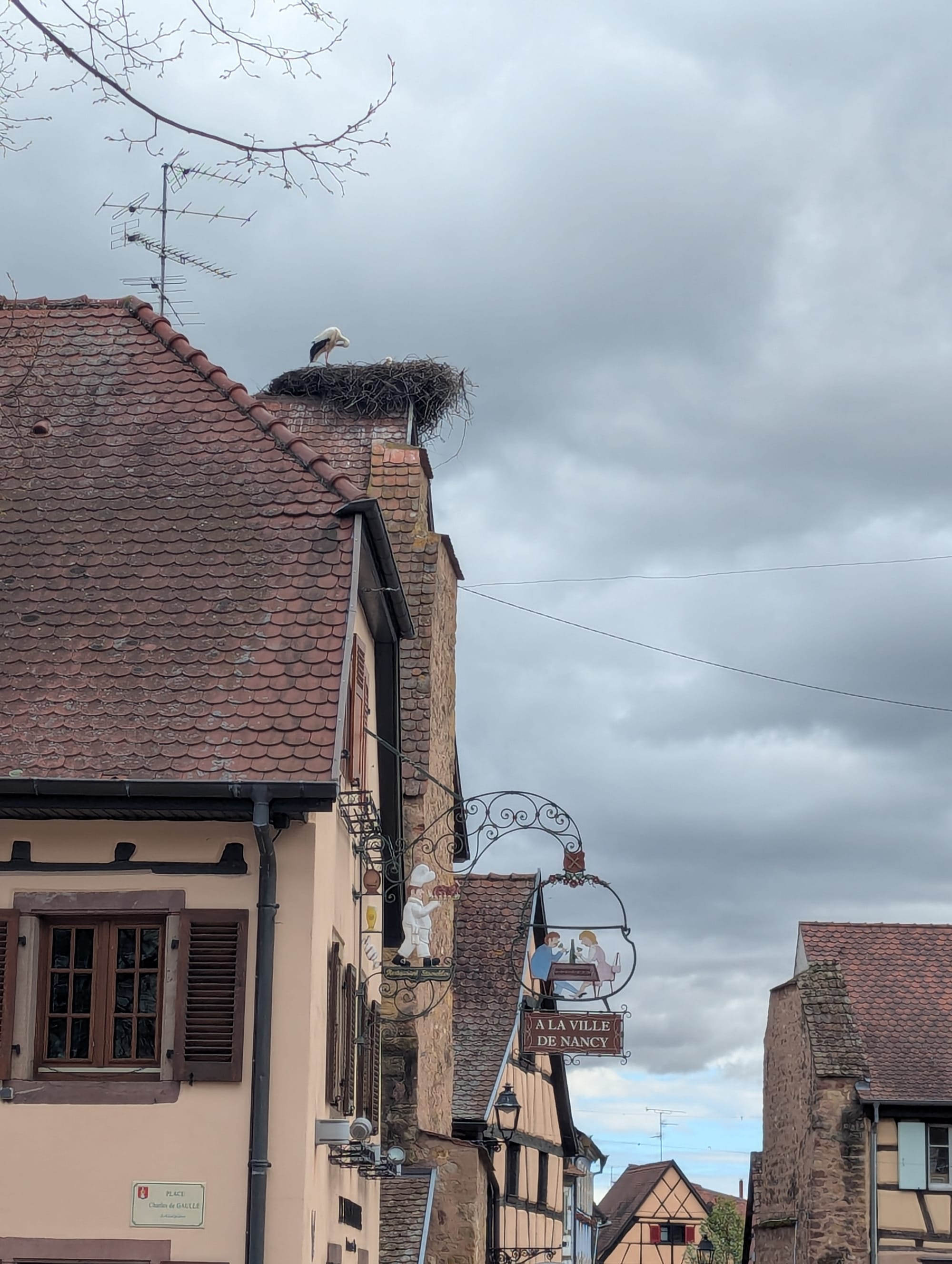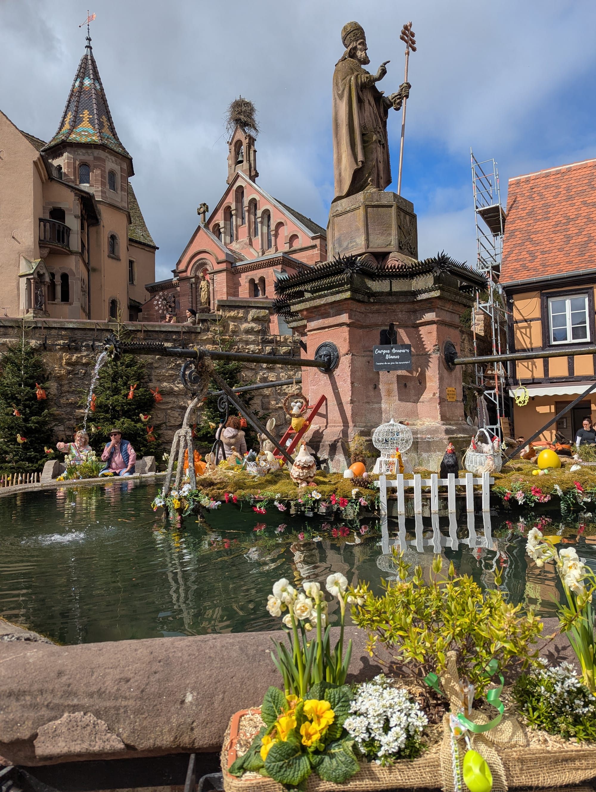 Today's photos are from Eguisheim. There is one photo with three towers in the on the top of a mountain. These are the remains of castle ruins. We didn't have enough time to hike there - but it is possible from this town along the vineyard. The town was all dressed up for Easter and note the stork nests.