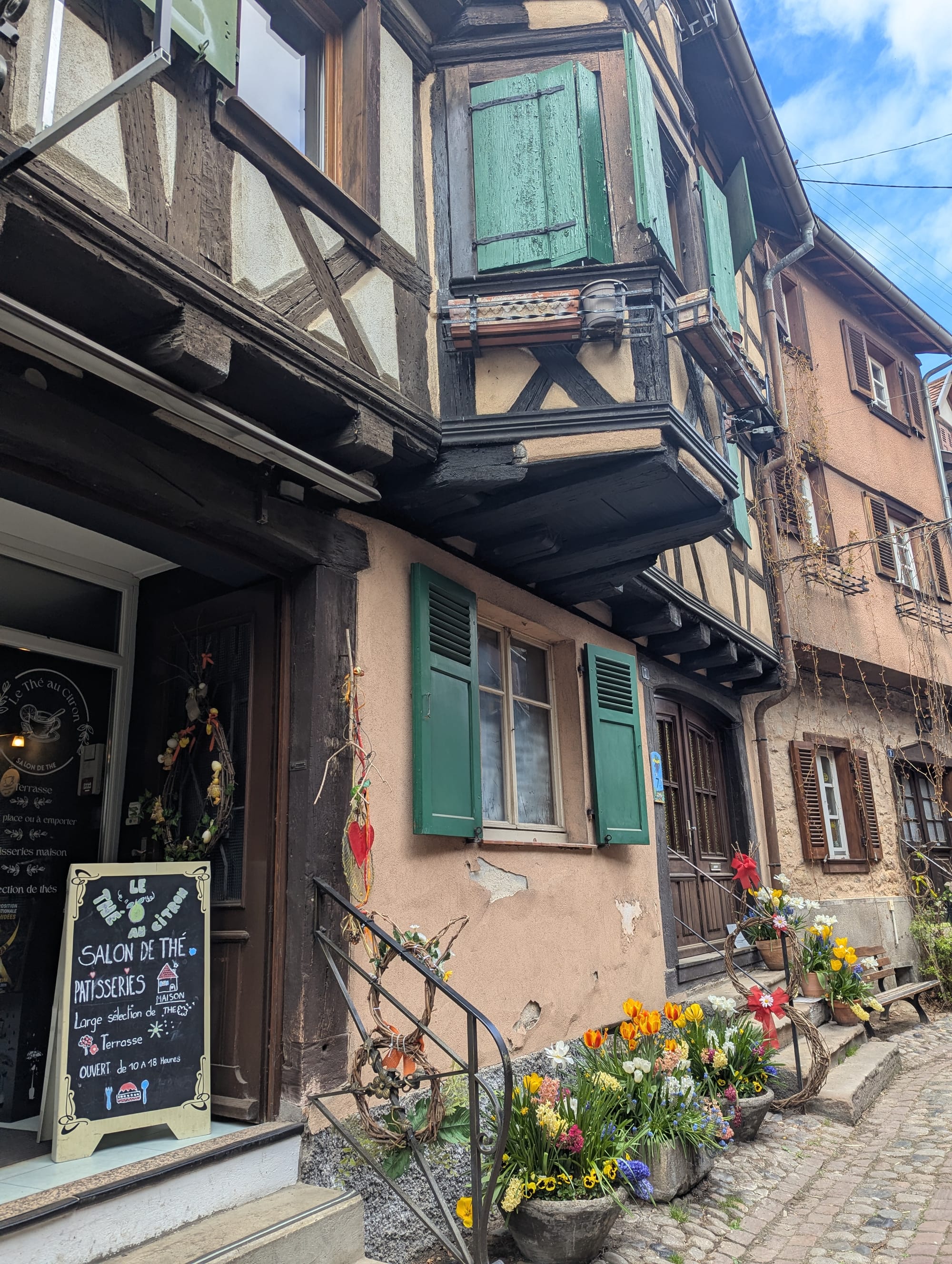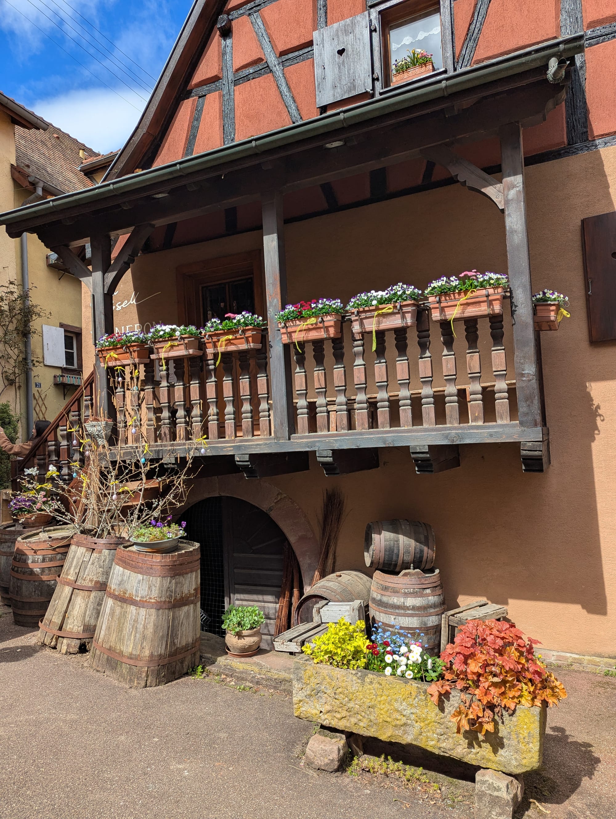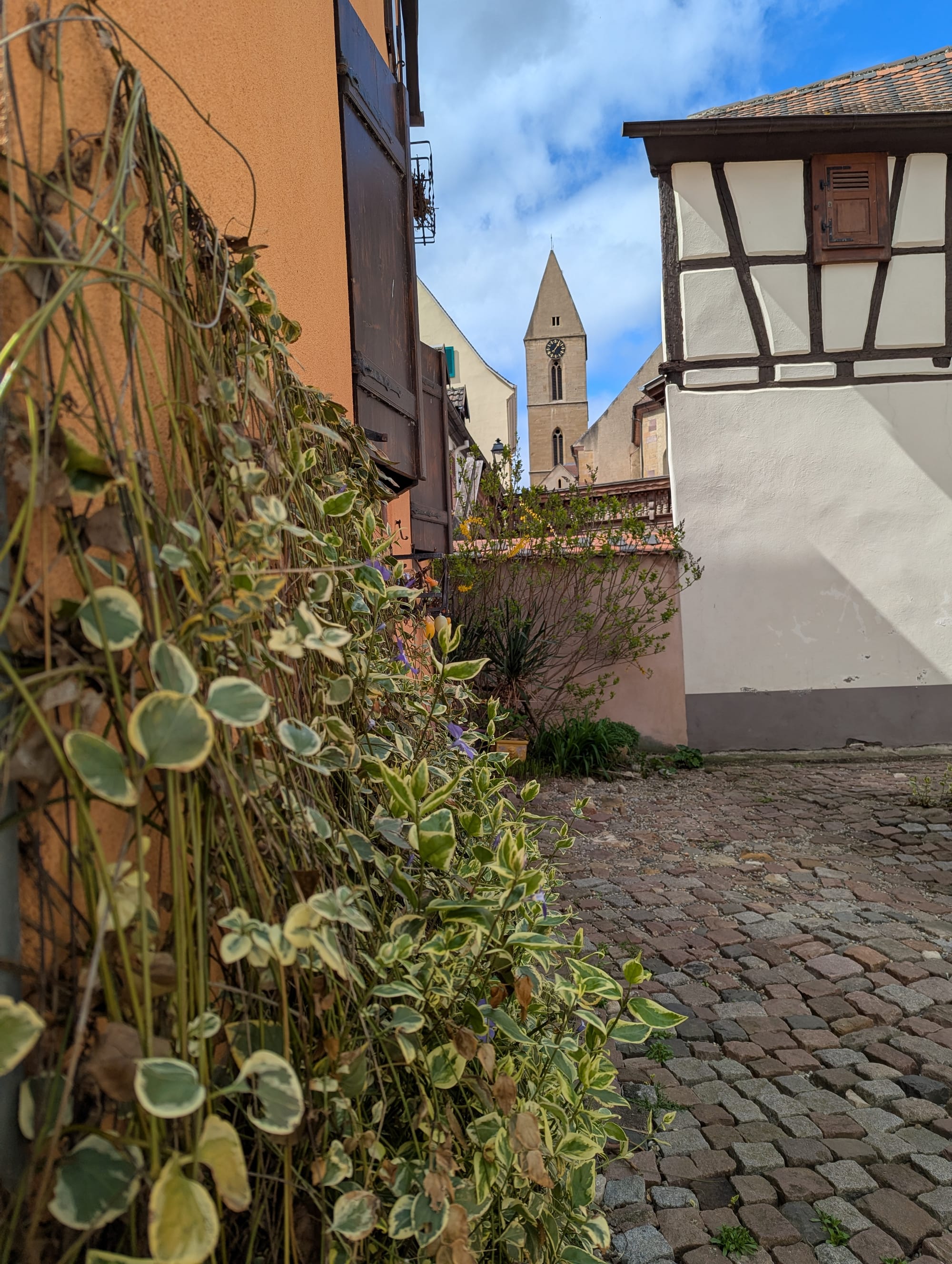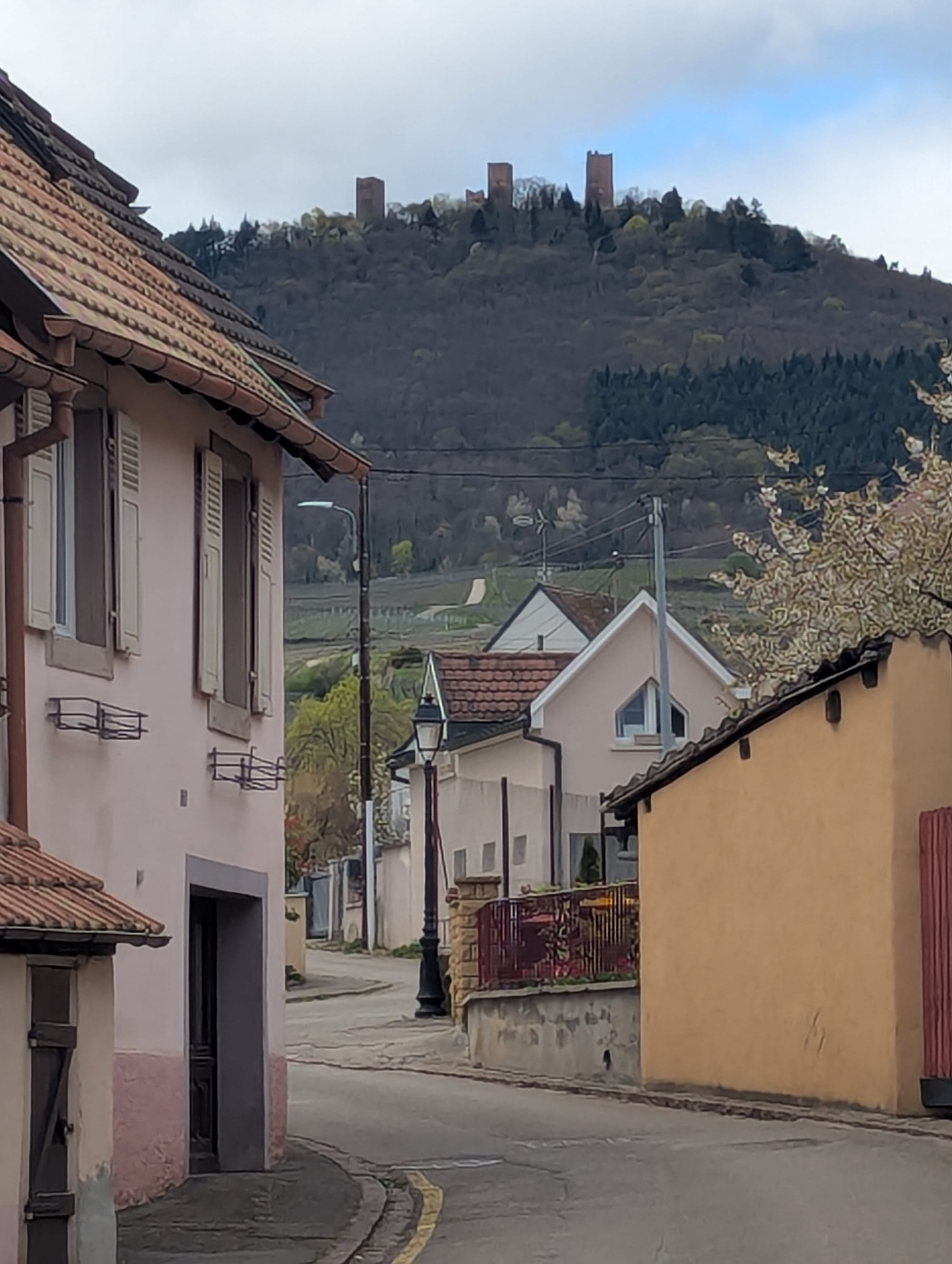 Today's photos are from Eguisheim. There is one photo with three towers in the on the top of a mountain. These are the remains of castle ruins. We didn't have enough time to hike there - but it is possible from this town along the vineyard. The town was all dressed up for Easter and note the stork nests.