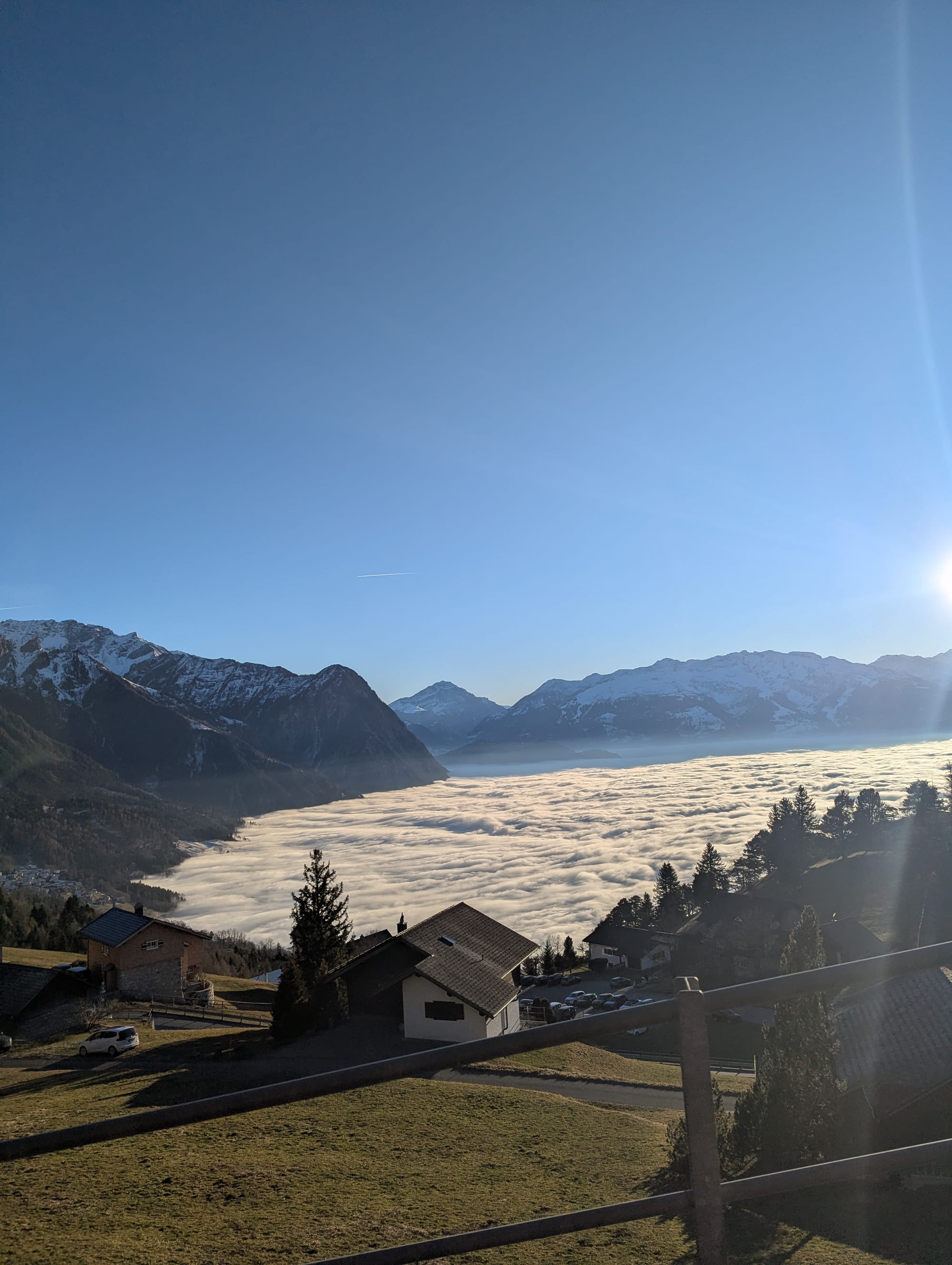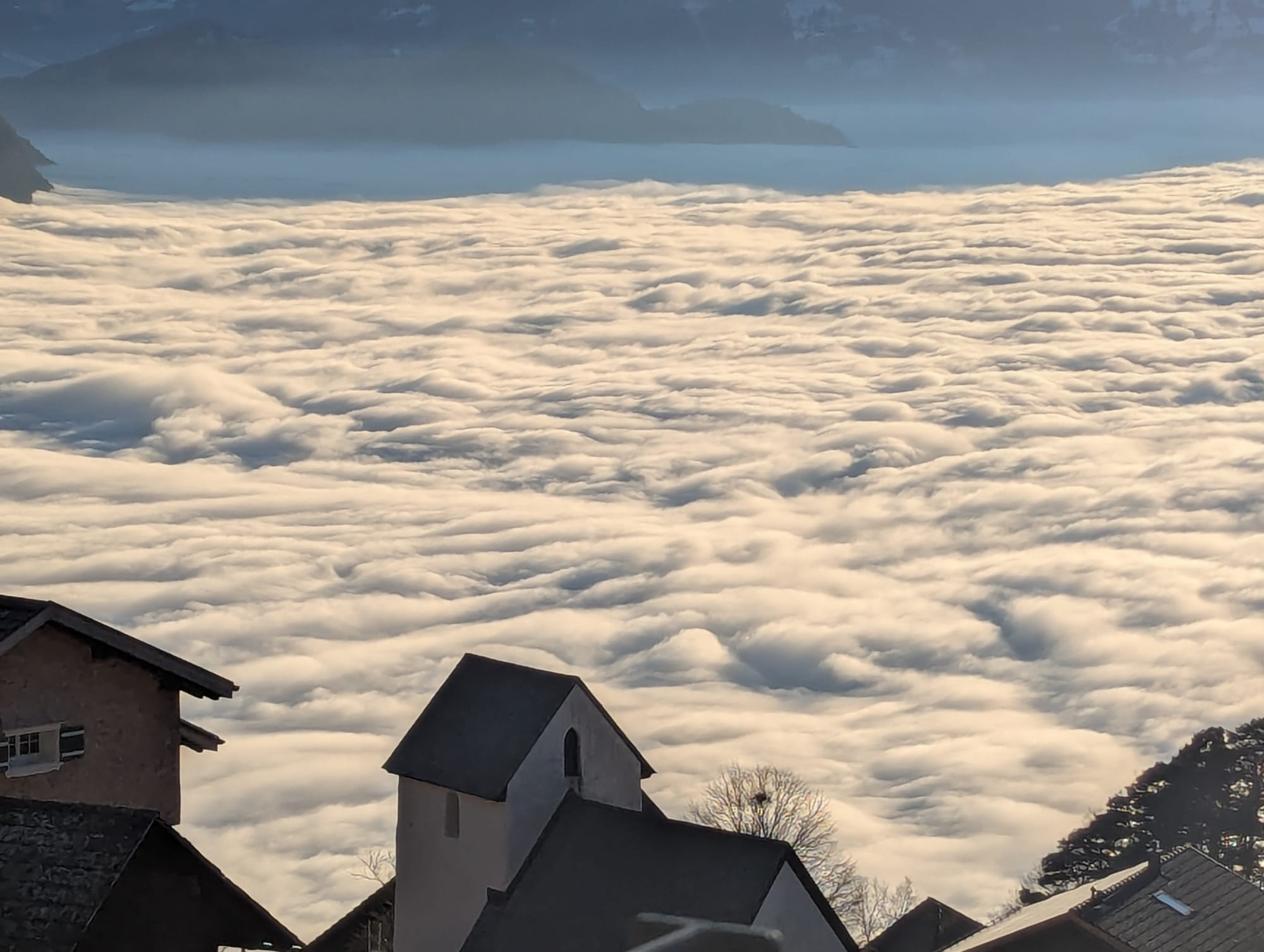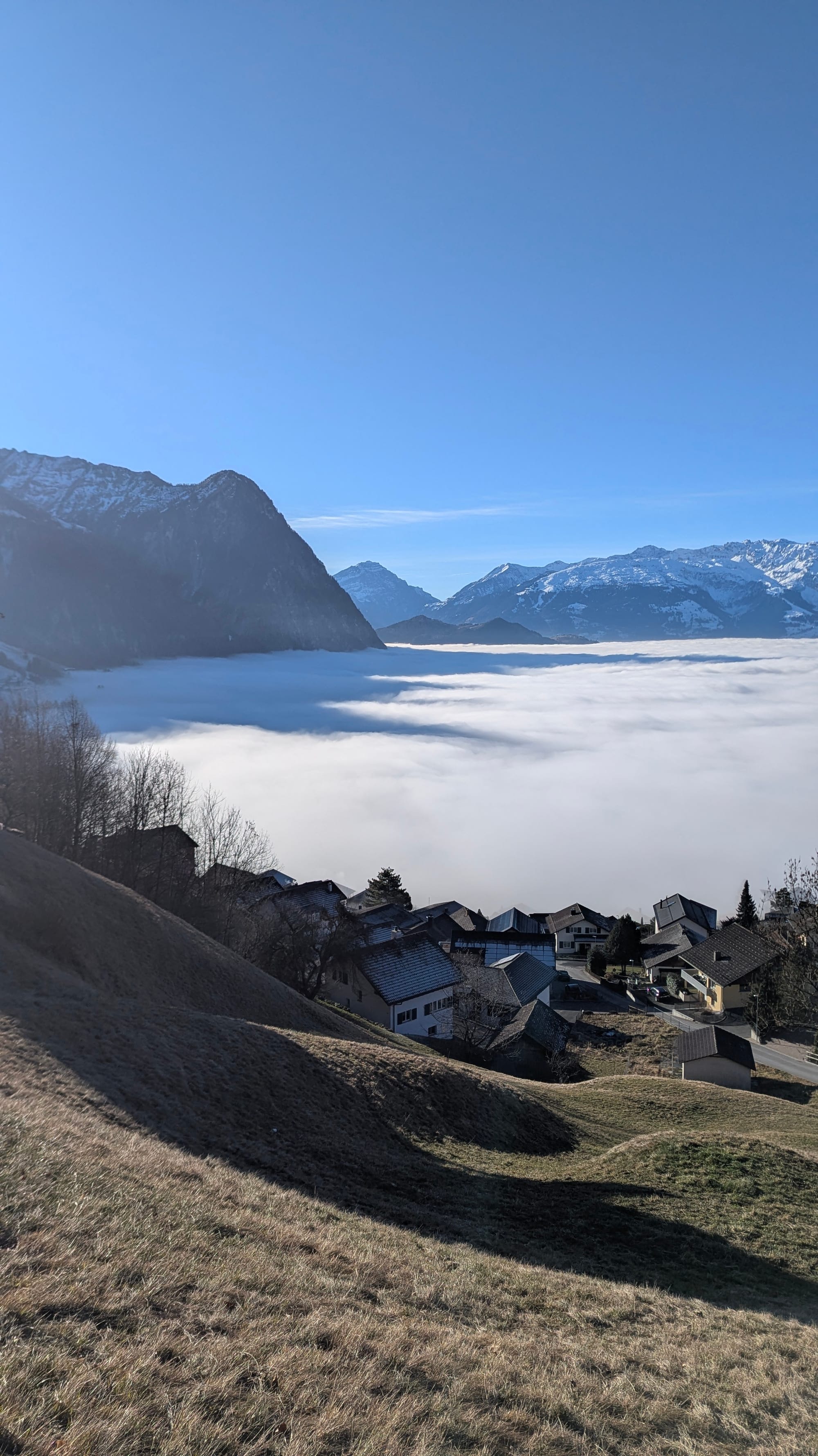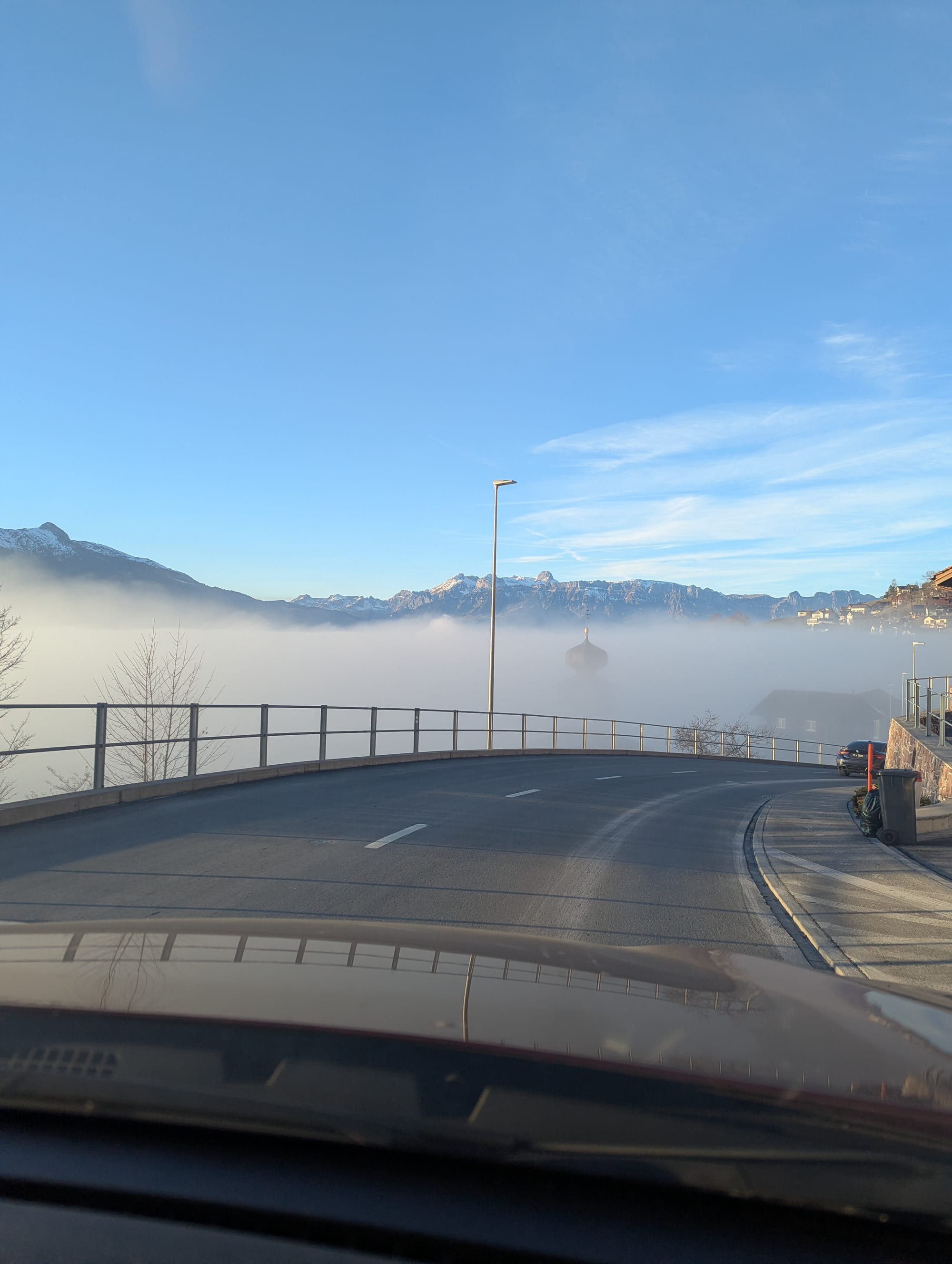 We spent a few days around Gaflei, Liechtenstein recently and it literally feels like you are above the clouds. It is 1500 meters above sea level so it is considered high altitude. I admit it clearly took me a bit to get acclimated. (I had a headache and I needed to take catch my breath the first couple minutes of walking). But, it was all worth it as it felt like you were above the clouds. We stayed in Triesenberg (1200 meters above sea level) which is 13 minutes by car/bus further down the mountain and the fog was so thick it was unbelievable. You could see it creeping into the car garage and at times - at night barely able to see across the street. Looking out - at times - it looked more like a lake than looking down a mountain with fog. The photos were all taken either at the top or on the way up the mountain and all on the same weekend.